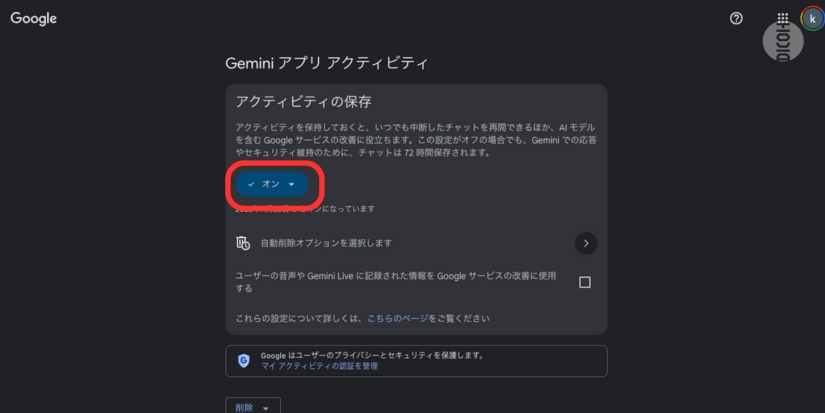 今後のチャットはアクティビティに表示されず、Google にフィードバックを送信するという選択をしない限り、AI モデルのトレーニングに使用されることもありません。チャットは今後も、Gemini の回答やフィードバック処理を行うために、また Google とそのユーザー、一般の人々を保護する目的で 72 時間保存されます。