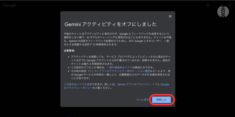 「Geminiアクティビティをオフにしました」と表示されるので「理解した」を選択。